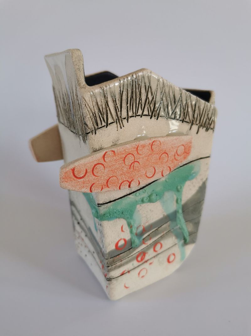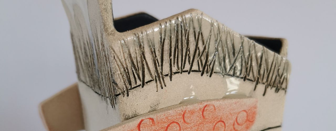 My work often relates to archaeology, and to objects and the stories they tell in their use and wear. My more recent pieces are also influenced by my love of nature and landscape, especially the beautiful environment of the orchard surrounding my workshop, and I am currently exploring the way in which traces of the past are visible in the landscape all around us. The finished ceramics are made by slab building stoneware clay, using the resulting forms as canvases to produce abstract pieces using a number of techniques to apply texture and colour with slips and glazes.
