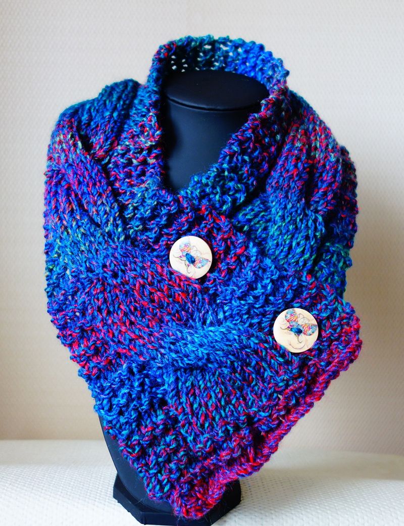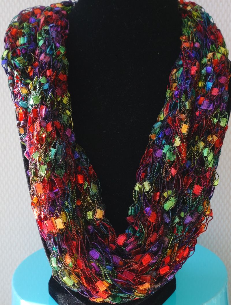 I handknit neck-warmers, hats, fingerless mitts, shawls, shrugs and necklace cowls with a yarn, with a jewel like glisten. Beautiful and useful accessories for all year round .